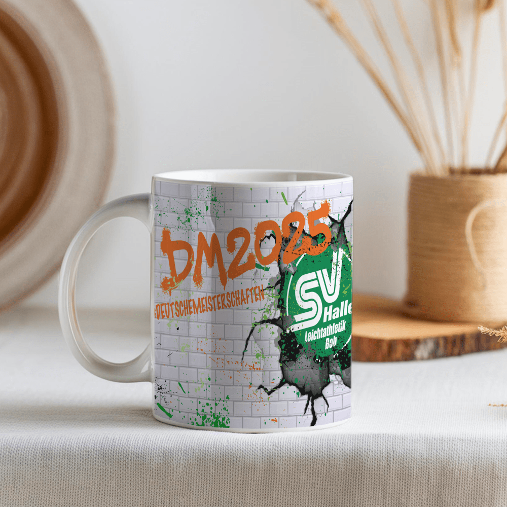Weiße Tasse mit dem Design der SV Halle Leichtathletik/Bob DM Verabschiedung 2025. Zeig allen, dass du ein Teil der Deutschen Meisterschaften 2025 bist.